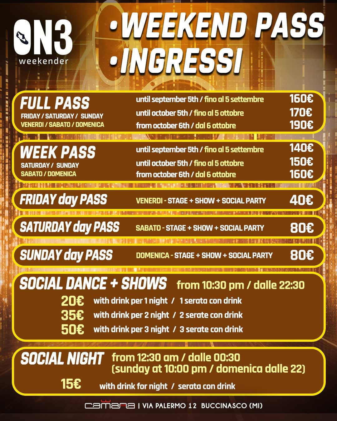 The event will take place in Milan, at Camana Club – Via Palermo 12, Buccinasco (MI), with three days of training, performances and unforgettable parties.