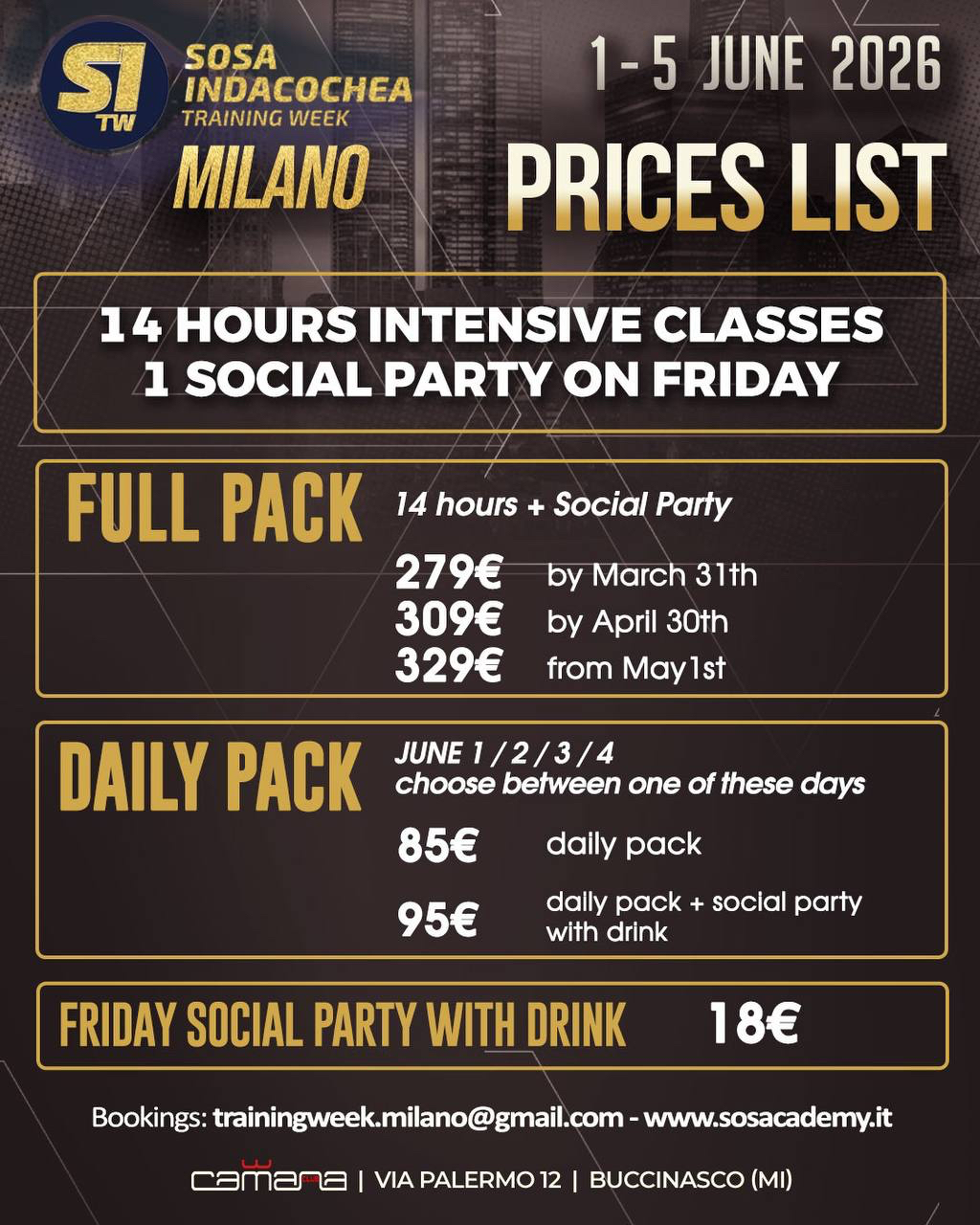 L’evento si terrà a Milano, presso il Camana Club – Via Palermo 12, Buccinasco (MI), con stage e una serata indimenticabile.